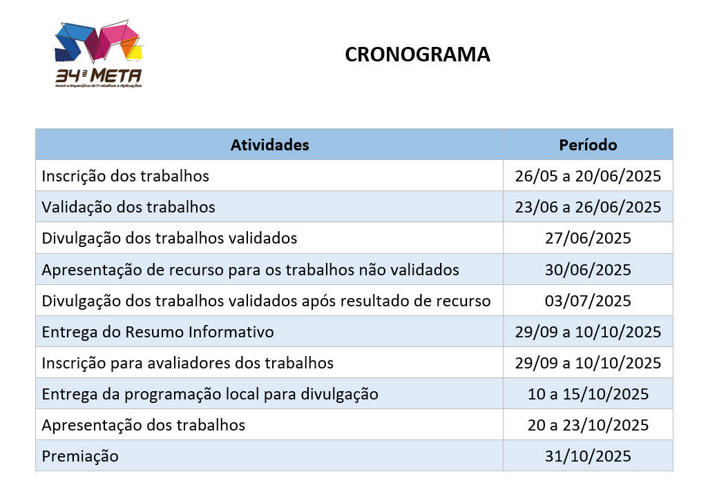 | Prorrogado o período de inscrições de trabalhos da 34ª META 2025